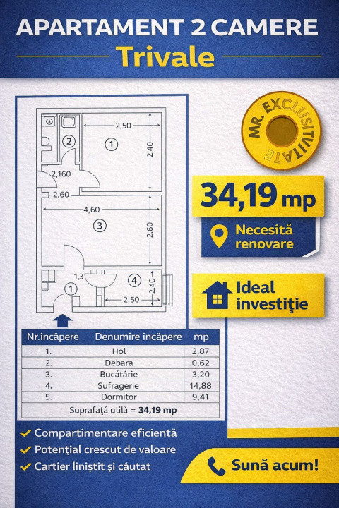 n cartierul Trivale, chiar lângă Școala 13, se află un apartament cu 2 camere care așteaptă să fie transformat în „acasă”. Cu o suprafață totală de 34,19 mp, locuința oferă o compartimentare practică și luminoasă, fiind potrivită atât pentru locuit, cât și pentru investiție. Apartamentul necesită renovare completă, dar tocmai acest lucru îi oferă viitorului proprietar libertatea de a-l amenaja exact așa cum își dorește. Blocul are acoperișul recent izolat, un plus important pentru confort și siguranță. Poziția excelentă, la câțiva pași de școală, magazine și mijloace de transport, îl face ideal pentru o familie tânără, pentru persoane în vârstă sau chiar pentru închiriere pe termen lung. Dacă ești în căutarea unui proiect de renovare cu potențial mare și o zonă liniștită, plină de verdeață, acest apartament din Trivale este alegerea potrivită. 📞 Te aștept la vizionare! 0% comision pentru cumpărător.