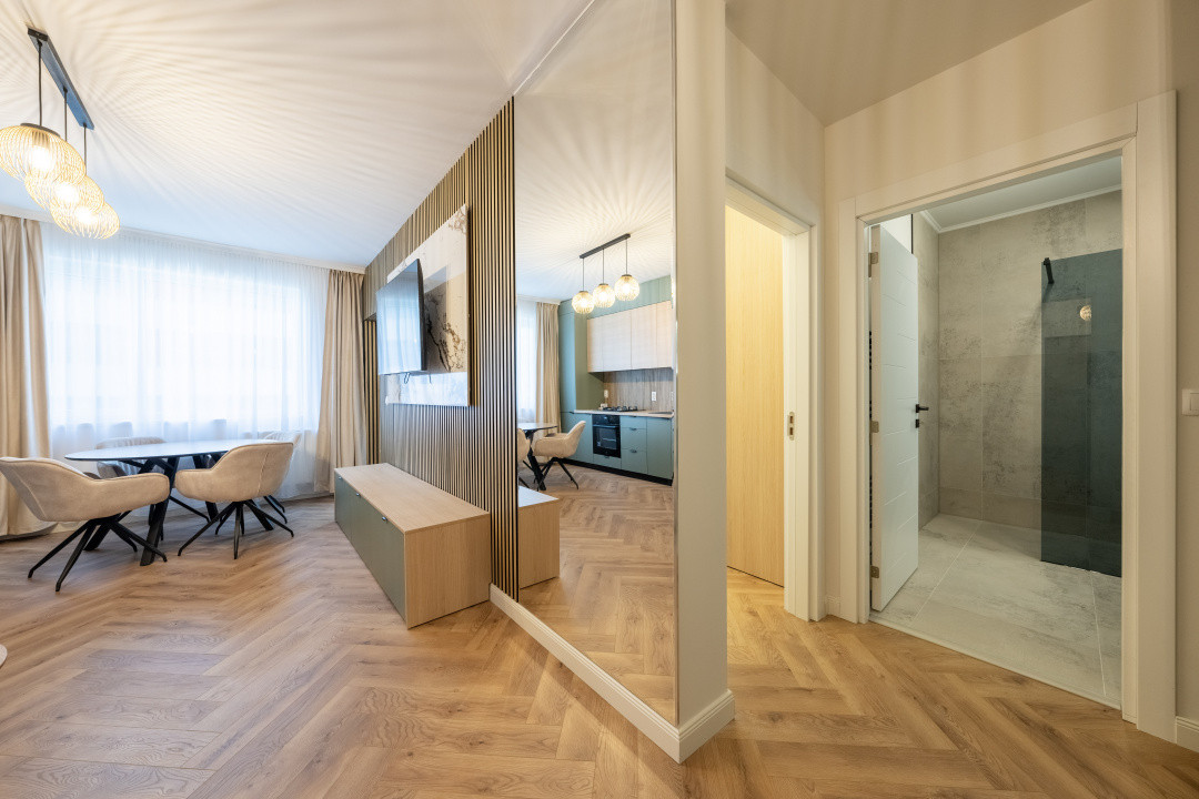 Suprafata de 43 mp foarte bine eficientizata este potrivita atat pentru locuinta pentru o persoana / cuplu cat si pentru investitie cu rentabilitate foarte buna in Airbnb.