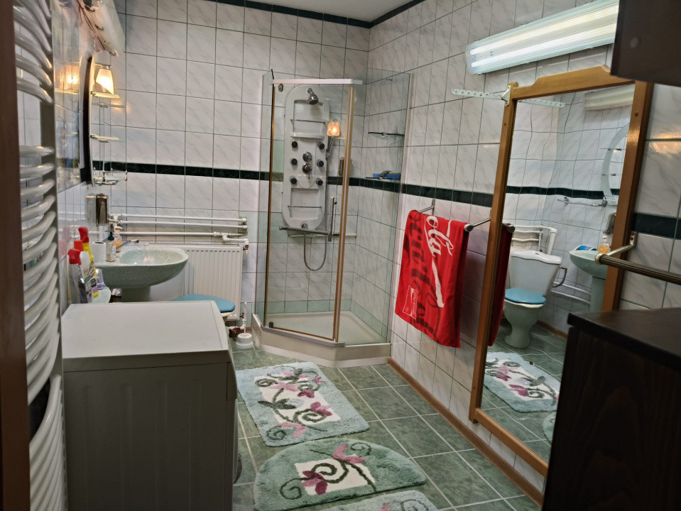 * baie spațioasă, dotată cu cabină de duș cu vibromasaj, mașina de spălat