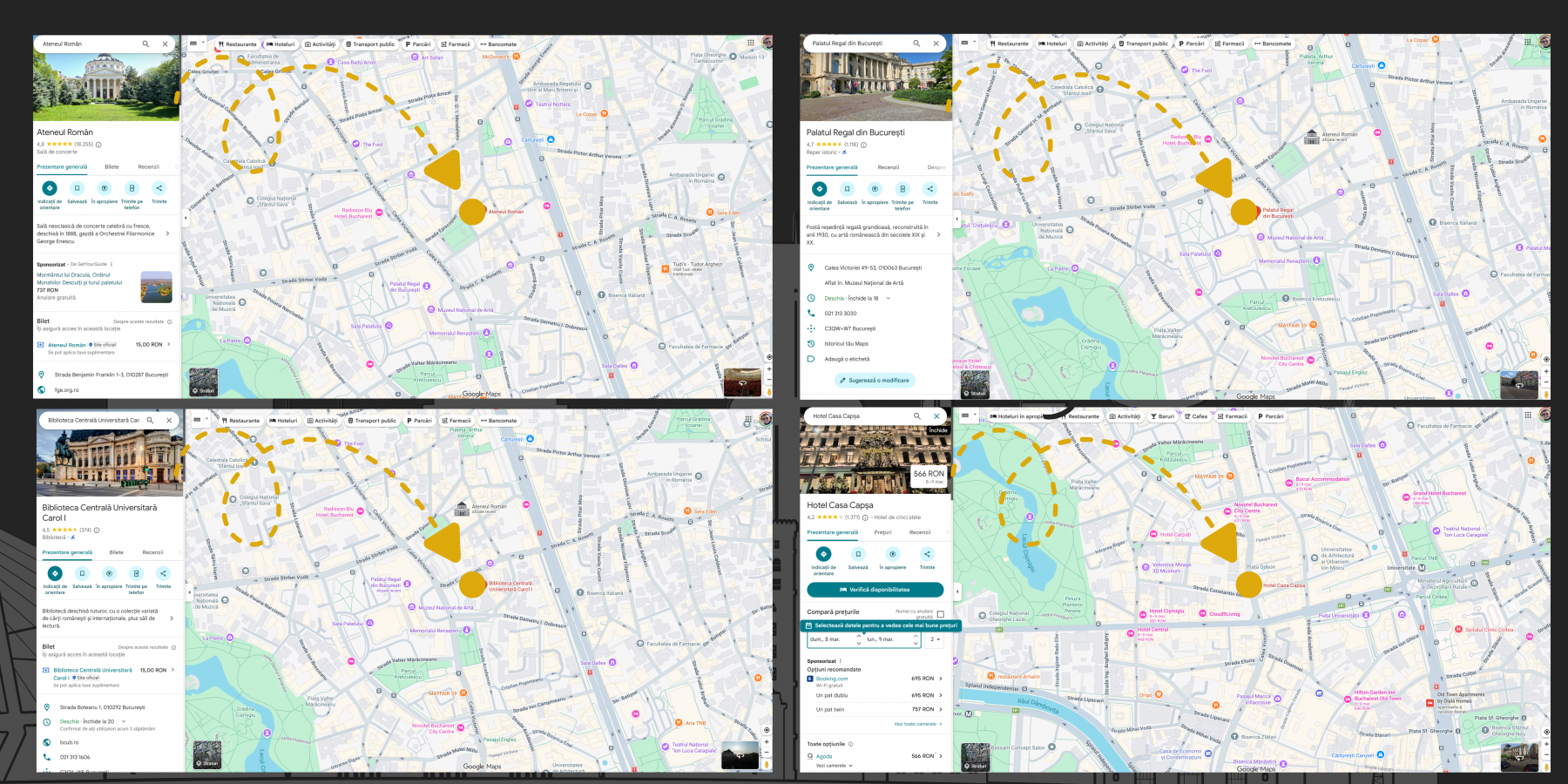 Alege o locație din lista de mai jos (Ateneu, Palatul Regal, Biblioteca Centrală, etc.).