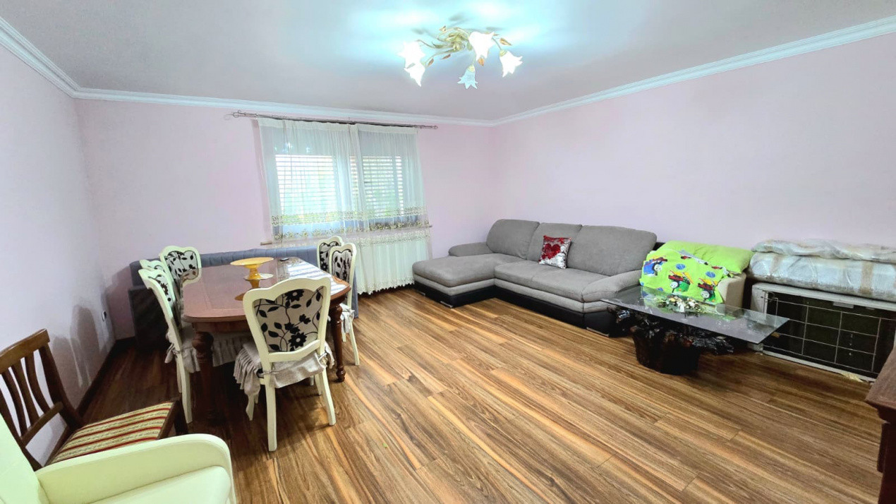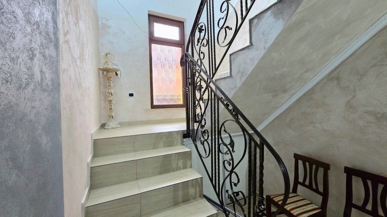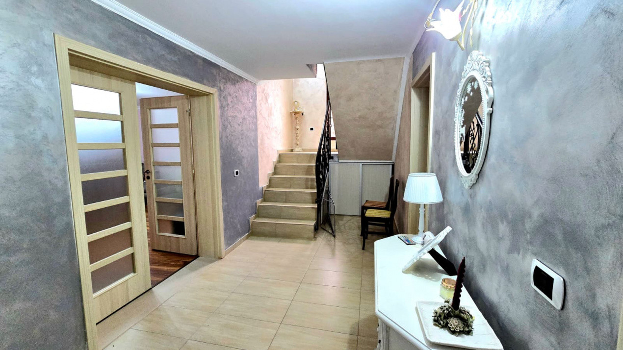 Dispune de 3 camere, bucătărie, 2 băi, dressing, cameră tehnică ( centrala termică pe gaz), hol cu treptele de acces la dormitoare, și o terasă deschisă.