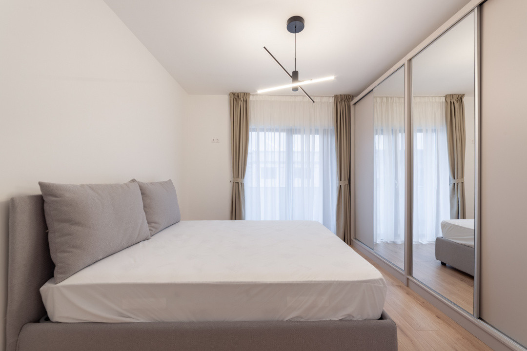 Etaj: 3 camere: doua dormitoare, dintre care unul matrimonial cu baie proprie, iar cea de-a treia camera poate fi amenajata in functie de necesitatile si preferintele chiriasului: dormitor suplimentar, dressing, birou sau sala de fitness. Exista o baie separata pentru celelalte camere.