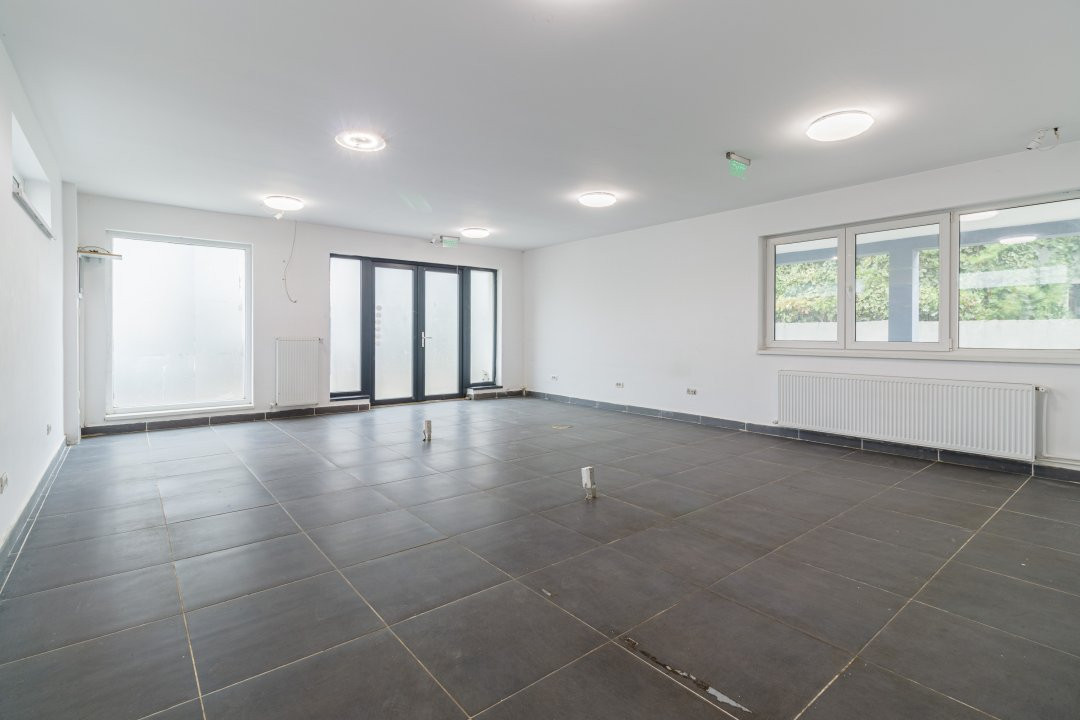 La parter, spațiul principal este generos și are acces direct din stradă, ceea ce îl face potrivit pentru birouri, spații comerciale sau chiar o zonă de living deschisă. Tot aici se află două grupuri sanitare, o bucătărie cu cuptor și drenaj instalat, o anexă laterală pentru depozitare și o terasă spațioasă.