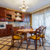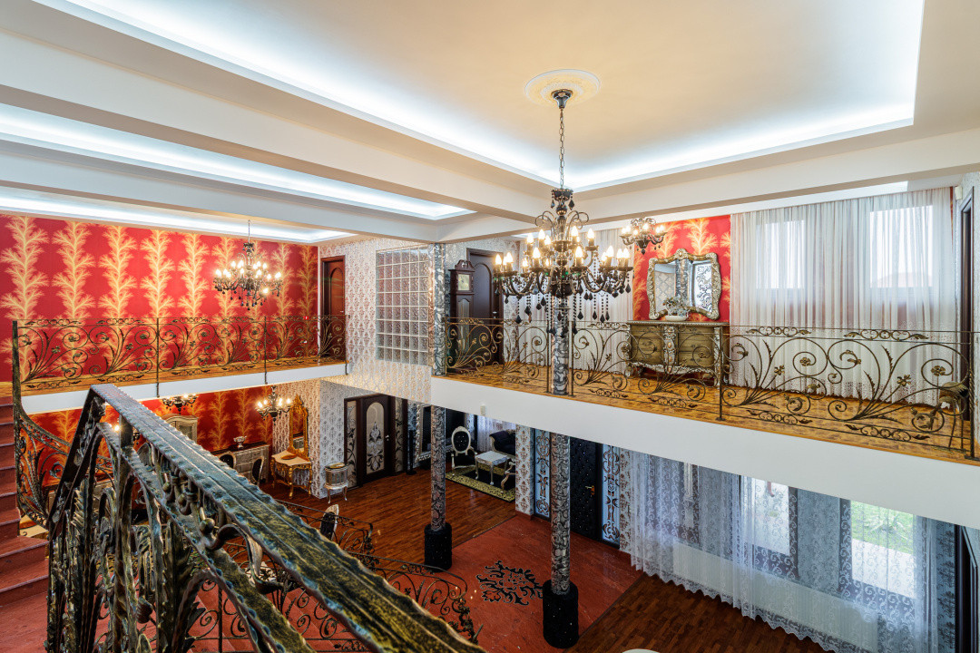 Interiorul oferă un living foarte generos, cu scara principală ca element central, feronerie lucrată manual și zone de relaxare distincte. Bucătăria este spațioasă, din lemn masiv, cu zonă de dining inclusă și acces direct către terasă.