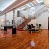 Interiorul oferă un living foarte generos, cu scara principală ca element central, feronerie lucrată manual și zone de relaxare distincte. Bucătăria este spațioasă, din lemn masiv, cu zonă de dining inclusă și acces direct către terasă.