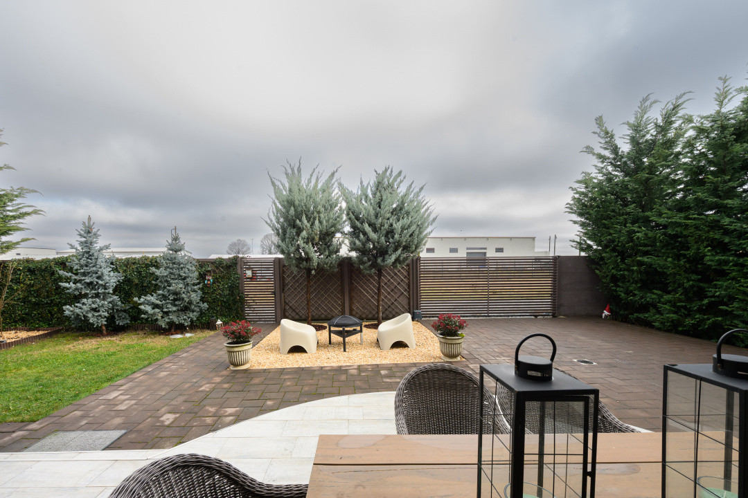 *** Terenul de 450 mp este amenajat cu gazon și vegetație matură, creând un ambient plăcut și intim. Proprietatea este completată de sistem de supraveghere video, porți electrice din fier și se vinde complet mobilată și utilată, conform prezentării.