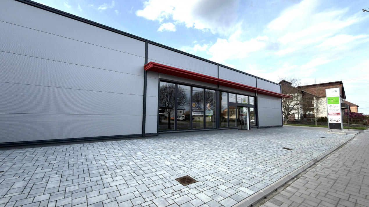Clădirea din panouri sandwich construită in 2025 este dotat cu vitrine generoase din PVC cu geamuri termopan de aproximativ 35 mp pe 2 fronturi stradale unul de 23m iar al doilea de 13m.