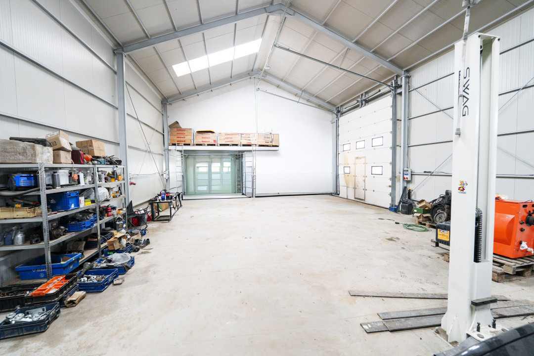Alimentarea electrica este asigurata prin curent trifazat 380V – 30 kW, cu posibilitate de extindere. Proprietatea include poarta automata smart de 8 m, iluminat interior si exterior smart, statie de incarcare pentru masini electrice si elevator auto demontabil.