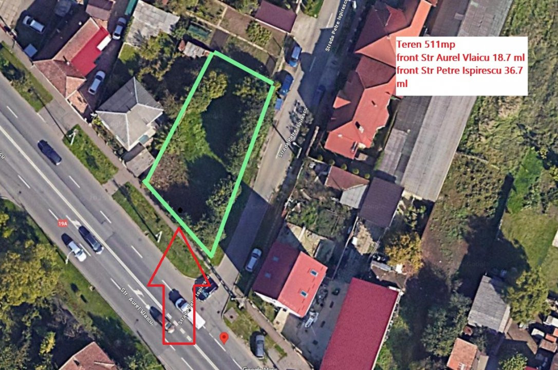 Terenul are 2 fronturi, cu 18,7 metrii liniari pe Aurel Vlaicu și 36,7 pe str. Petre Ispirescu.
